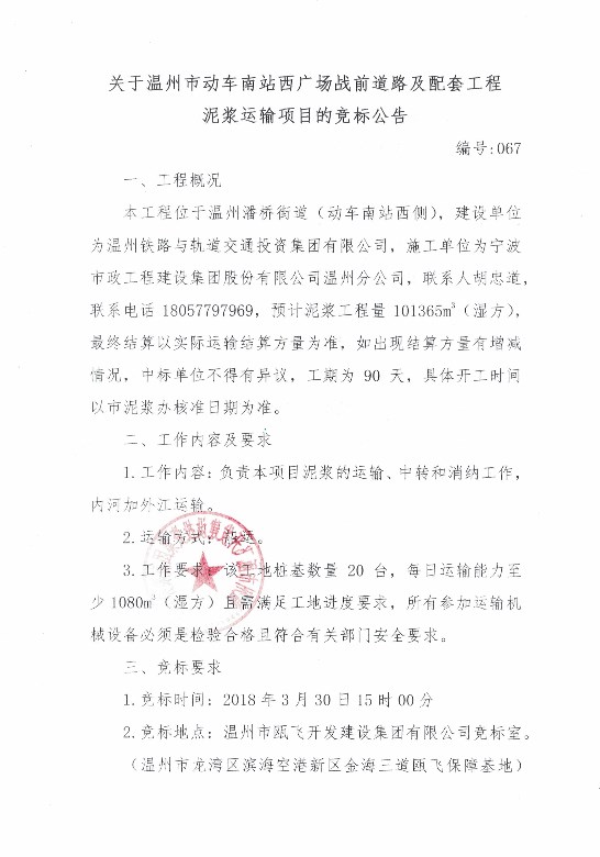 关于温州市动车南站西广场战前门路及配套工程泥浆运输项目的竞标通告