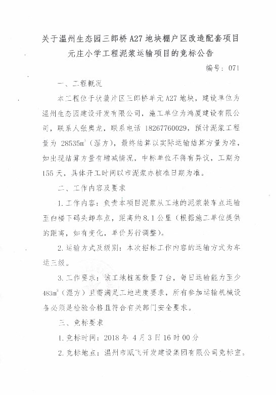 ¹ØÓÚÎÂÖÝÉú̬԰ÈýÀÉÇÅA27µØ¿éÅï»§Çø¸ïÐÂÅäÌ×ÏîĿԪׯСѧ¹¤³ÌÄཬÔËÊäÏîÄ¿µÄ¾º±êͨ¸æ
