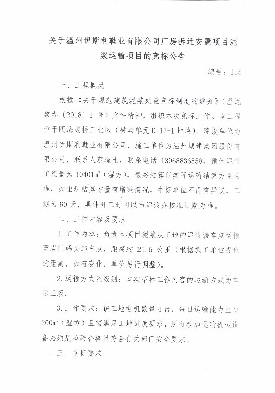 关于温州伊斯利鞋业有限公司厂房拆迁安顿项目泥浆运输项目的竞标通告