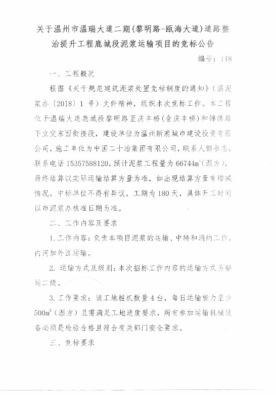 ¹ØÓÚÎÂÖÝÊÐÎÂÈð´óµÀ¶þÆÚ£¨ÀèÃ÷·-걺£´óµÀ£©ÃÅ·ÕûÖÎÌáÉý¹¤³Ì¹³Ç¶ÎÄཬÔËÊäÏîÄ¿µÄ¾º±êͨ¸æ