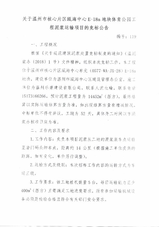 ¹ØÓÚÎÂÖÝÊн¹µãÆ¬Çøê±º£ÖÐÐÄE-18aµØ¿éÌåÓý¹«Ô°¹¤³ÌÄཬÔËÊäÏîÄ¿µÄ¾º±êͨ¸æ