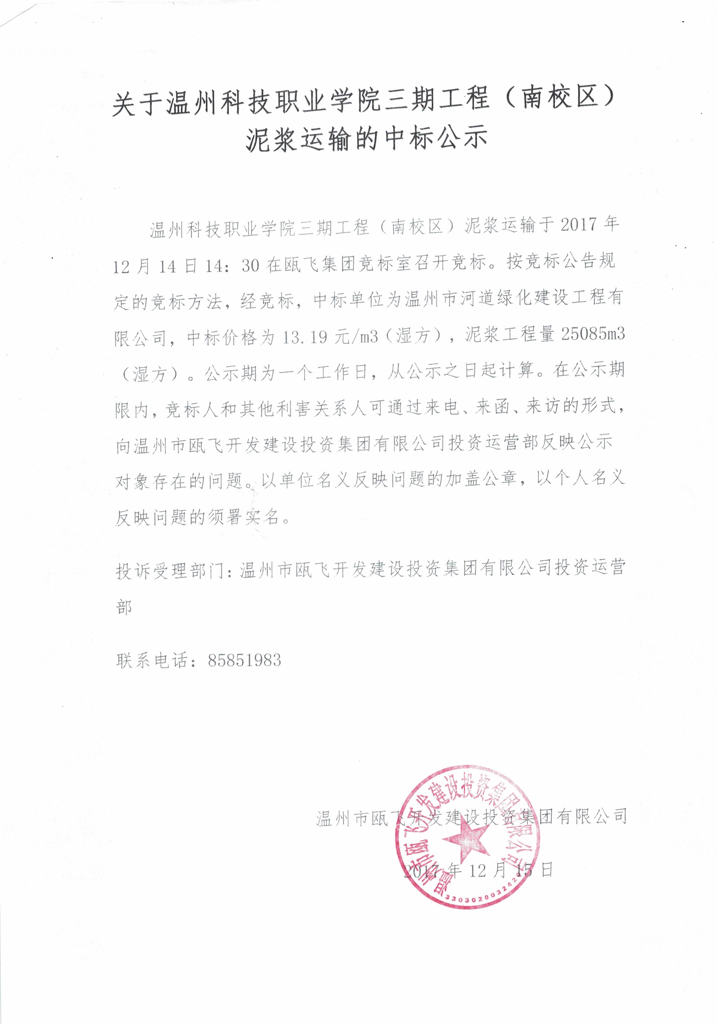 ÎÂÖݿƼ¼Ö°ÒµÑ§ÔºÈýÆÚ¹¤³Ì£¨ÄÏÐ£Çø£©ÄཬÔËÊäÓÚ2017Äê12ÔÂ14ÈÕ14£º30ÔÚBG´óÓμ¯Ížº±êÊÒÕÙ¿ª¾º±ê¡£°´¾º±êͨ¸æ»®¶¨µÄ¾º±êÒªÁ죬¾¾º±ê£¬Öб굥λΪÎÂÖÝÊкÓÁ÷ÂÌ»¯½¨É蹤³ÌÓÐÏÞ¹«Ë¾£¬Öбê¼Û¸ñΪ13.19Ôª/m3£¨Êª·½£©£¬Äཬ¹¤³ÌÁ¿25085m3£¨Êª·½£©¡£¹«Ê¾ÆÚΪһ¸öÊÂÇéÈÕ£¬´Ó¹«Ê¾Ö®ÈÕÆðÅÌËã¡£ÔÚ¹«Ê¾ÆÚÏÞÄÚ£¬¾º±êÈËºÍÆäËûÀûº¦¹ØÏµÈË¿Éͨ¹ýÀ´µç¡¢À´º¯¡¢À´·ÃµÄÐÎʽ£¬ÏòBG´óÓÎͶ×ÊÔËÓª²¿·´Ó¦¹«Ê¾¹¤¾ß±£´æµÄÎÊÌâ¡£ÒÔµ¥Î»ÃûÒå·´Ó¦ÎÊÌâµÄ¼Ó¸Ç¹«Õ£¬ÒÔ¸öÈËÃûÒå·´Ó¦ÎÊÌâµÄÐëÊðʵÃû¡£
