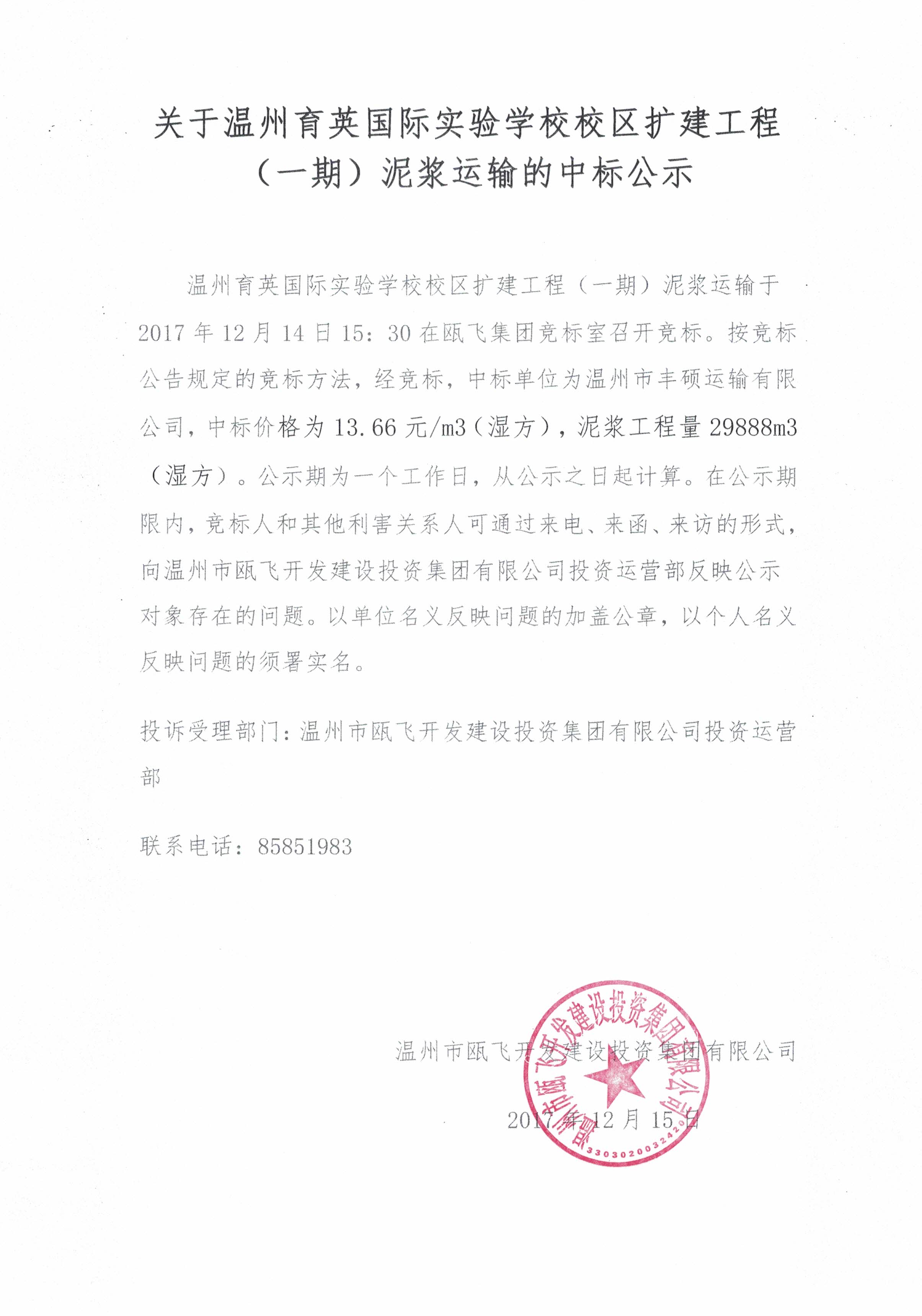 ÎÂÖÝÓýÓ¢¹ú¼ÊʵÑéÑ§Ð£Ð£ÇøÀ©½¨¹¤³Ì£¨Ò»ÆÚ£©ÄཬÔËÊäÓÚ2017Äê12ÔÂ14ÈÕ15£º30ÔÚBG´óÓμ¯Ížº±êÊÒÕÙ¿ª¾º±ê¡£°´¾º±êͨ¸æ»®¶¨µÄ¾º±êÒªÁ죬¾¾º±ê£¬Öб굥λΪÎÂÖÝÊзḻÔËÊäÓÐÏÞ¹«Ë¾£¬Öбê¼Û¸ñΪ13.66Ôª/m3£¨Êª·½£©£¬Äཬ¹¤³ÌÁ¿29888m3£¨Êª·½£©¡£¹«Ê¾ÆÚΪһ¸öÊÂÇéÈÕ£¬´Ó¹«Ê¾Ö®ÈÕÆðÅÌËã¡£ÔÚ¹«Ê¾ÆÚÏÞÄÚ£¬¾º±êÈËºÍÆäËûÀûº¦¹ØÏµÈË¿Éͨ¹ýÀ´µç¡¢À´º¯¡¢À´·ÃµÄÐÎʽ£¬ÏòBG´óÓÎͶ×ÊÔËÓª²¿·´Ó¦¹«Ê¾¹¤¾ß±£´æµÄÎÊÌâ¡£ÒÔµ¥Î»ÃûÒå·´Ó¦ÎÊÌâµÄ¼Ó¸Ç¹«Õ£¬ÒÔ¸öÈËÃûÒå·´Ó¦ÎÊÌâµÄÐëÊðʵÃû¡£